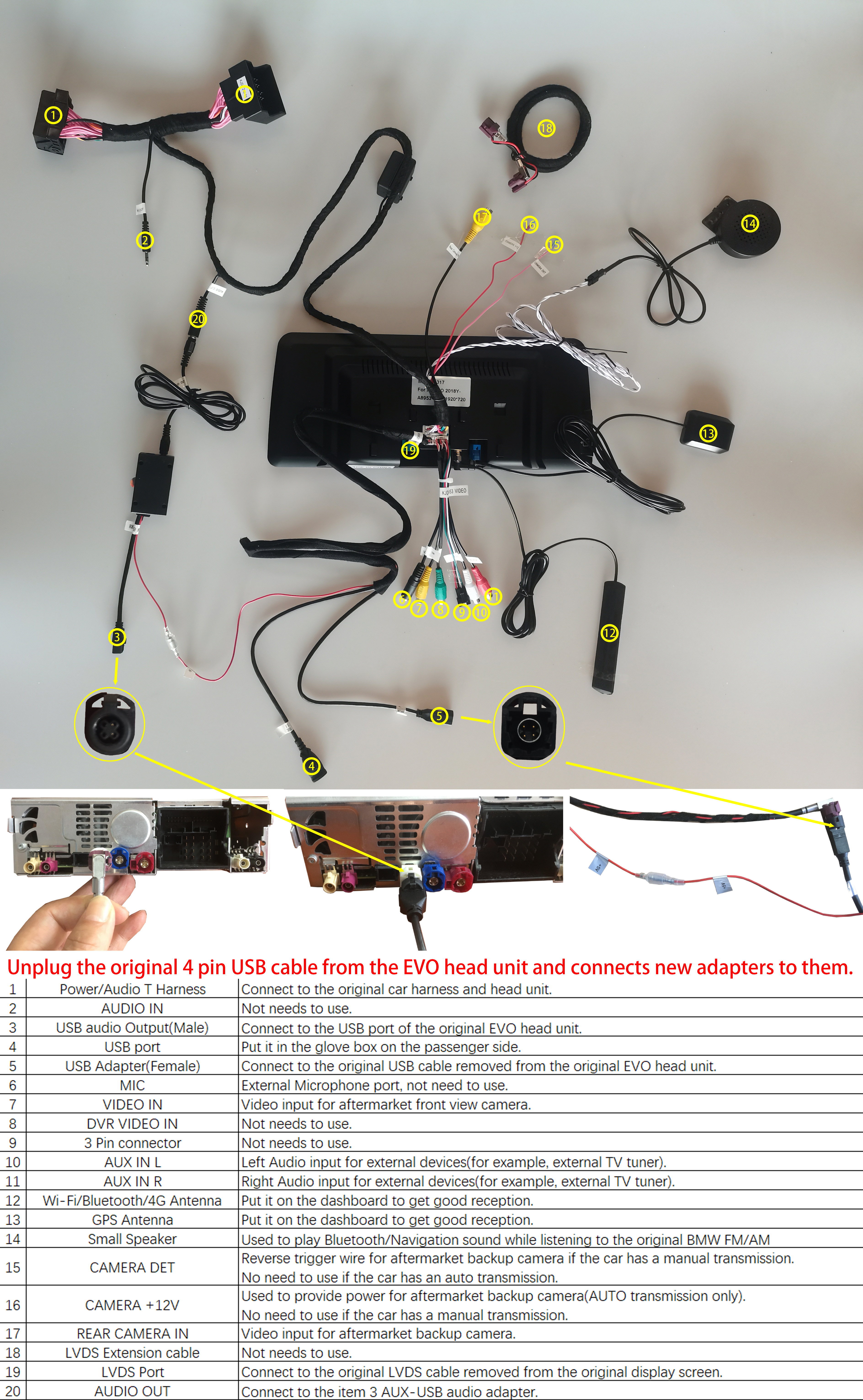 A. Please check the connection map and ensure you plug item 3 into the rear panel of the original head unit correctly.