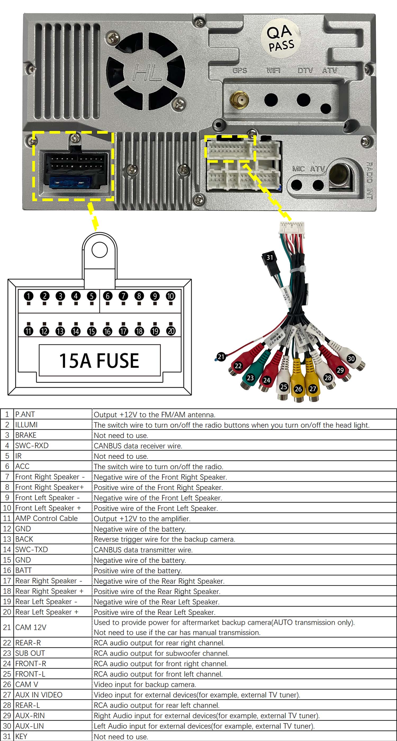 | RCA audio output | Front-Left, Front-Right, Rear-Left, Rear-Right, and Subwoofer(RCA port) | |