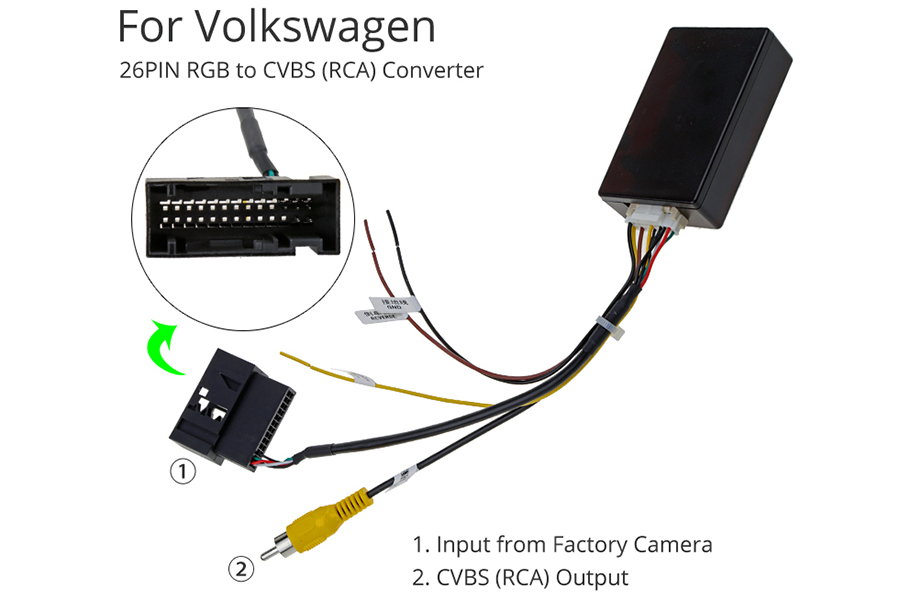 The factory Volkswagen backup camera has RGB video signal but the aftermarket head units only accept CVBS video signal. So when you replace the factory VW head unit with an aftermarket head unit, you may find that the original camera video does not show on the aftermarket radio's screen because the video format do not match. Then you need this item.